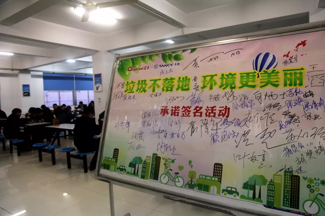 期間,天信黨委還利用午餐員工聚集的時間,組織員工在食堂進行了垃圾不落地、環(huán)境更美麗的全員承諾簽名活動。